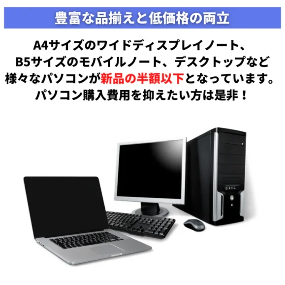 新品価格なら10万円以上するパソコンも中古であれば半額以下で購入できます。